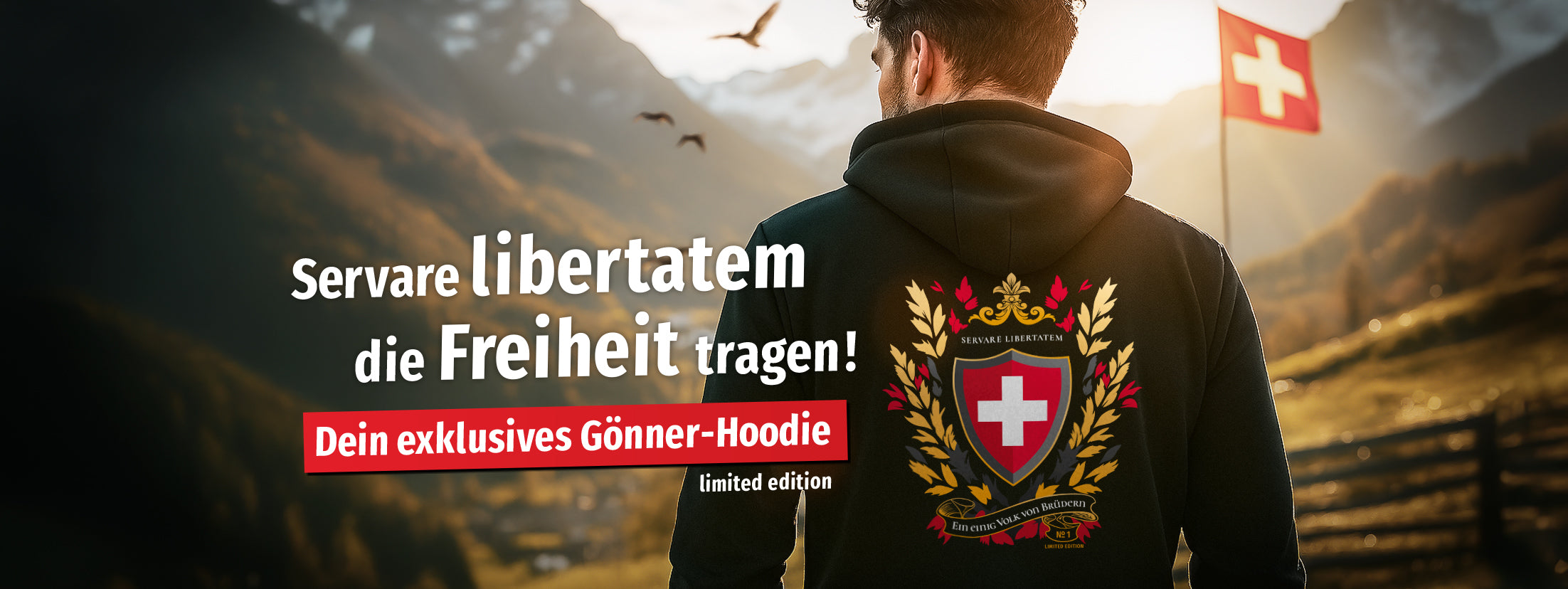 - Edles Design: Der Hoodie trägt die lateinische Inschrift «Servare Libertatem» (Die Freiheit bewahren) und «Ein einig Volk von Brüdern».